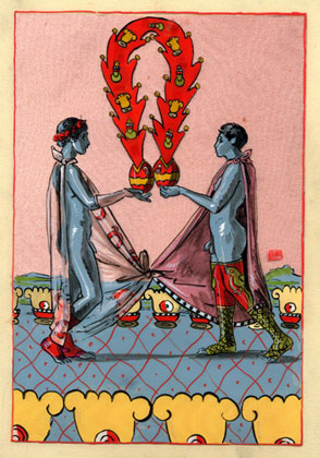 Acrylic, gouache, silk, satin and gold leaf on acetate mounted on paper