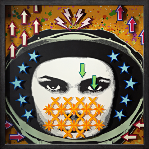 4 layered glass, stencil, spray paint, screen print & aluminium all in a bespoke black wooden frame