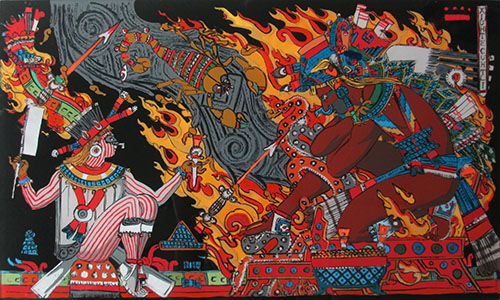 Acrylic, gold leaf and satin on reverse painted plexi glass.