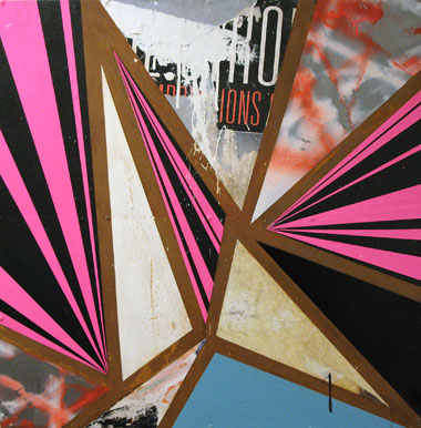 Found billboard paper, tape, latex paint, rust on steel mounted to wood panel
