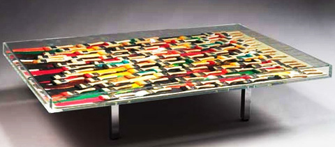 Brushes & paint on canvas in plexi frame & stainless steel leg table