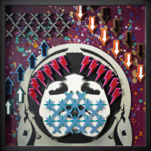 4 layered glass, stencil, spray paint, screen print & aluminium all in a bespoke black wooden frame