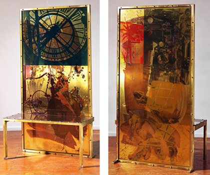 Screenprinting and hand-painted patinas on brass panels with aluminum and Lexan
