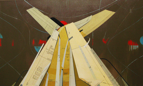 Acrylic and paper sewing patterns on canvas